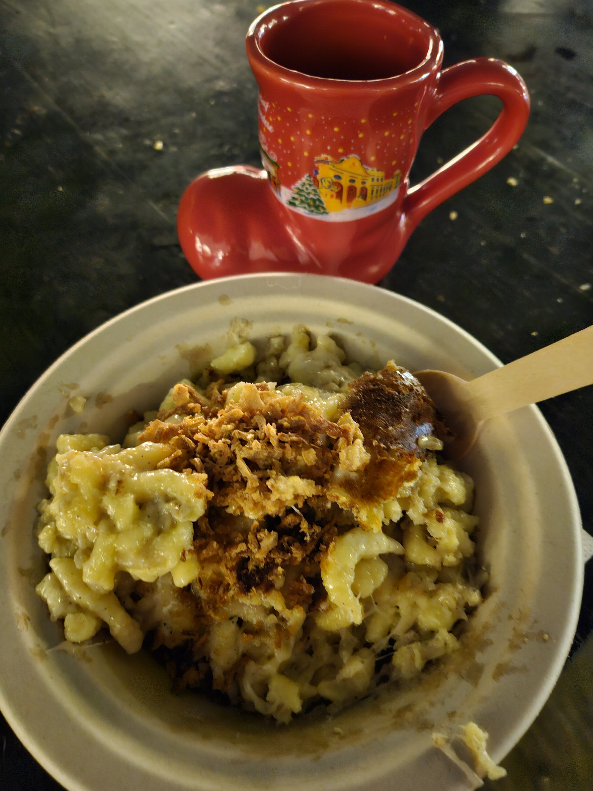 Food accoplished, so I was able to partake of gluwein. I forfeited the deposit and kept the mug. They came 4 colors (black, white, green, and red) I was debating on whether to keep one and decided that I really only liked the black one...so If I got one randomly, I'd keep it.